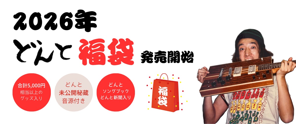 どんとオリジナルグッズや秘蔵音源などが入った特別な福袋です。 2026年新年の始まりにいかがですか? □福袋の内容 ・Tシャツ ・どんと非公開秘蔵音源 ・どんとソングブック ・どんと新聞 第8号(最新) ・他どんとオリジナルグッズなど 合計5,000円以上相当のグッズが入っています。 【ご購入に関する注意事項】 ※予定数量に達した時点で販売終了となります。 ※不良品などの理由で交換が発生した場合、福袋商品の性質上、交換前と同じ柄の商品をご指定いただくことはできませんので、ご了承ください。 ※商品内容に関する個別のお問い合わせにはお答えできかねます。 ※お客様都合による、返品・注文キャンセルはお受けできかねますのでご注意ください。